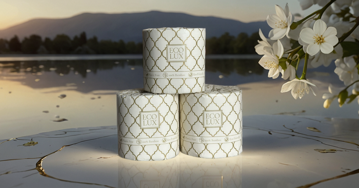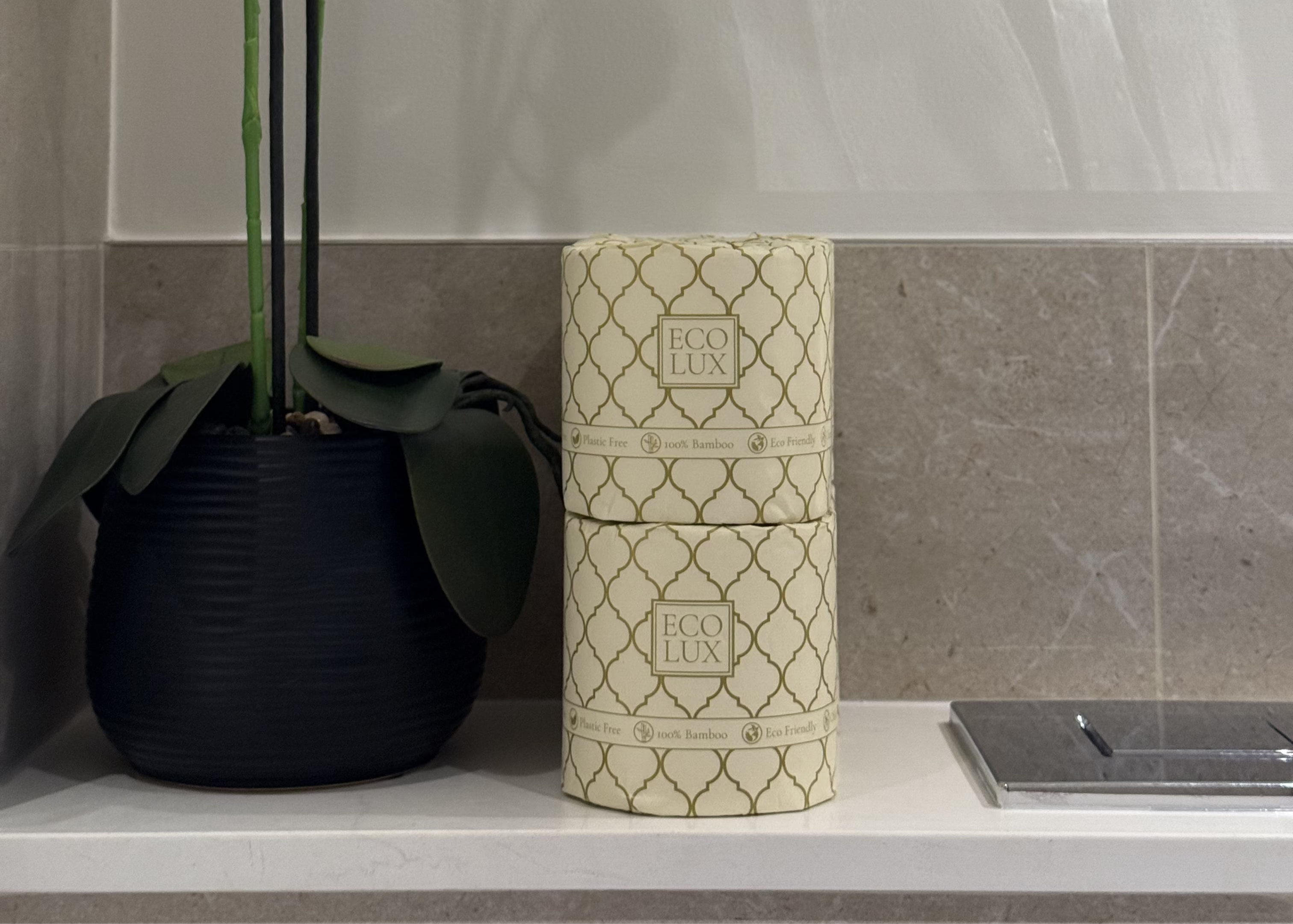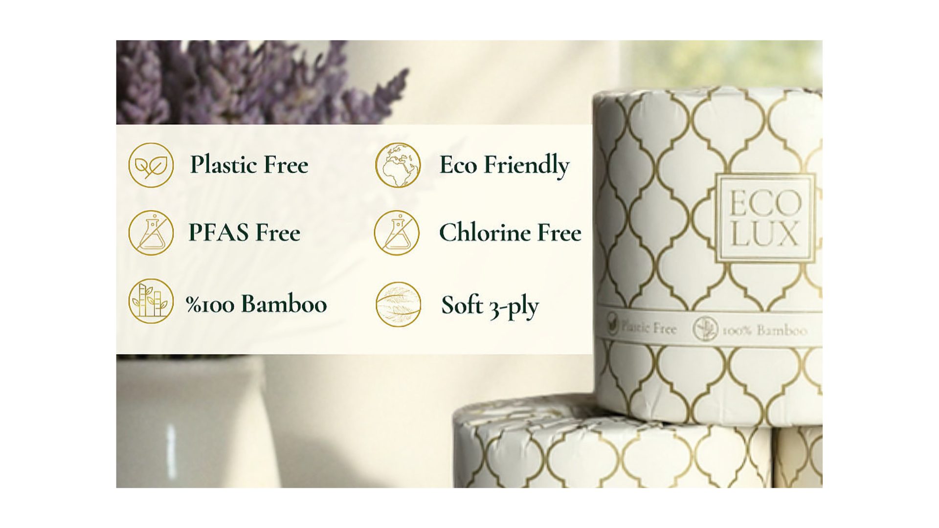 The Eco Lux roll is made from renewable bamboo, providing a softer, more sustainable alternative to traditional materials. Our absorbent 3-ply design delivers plush thickness, while remaining septic-safe, breaking down easily to protect plumbing and septic systems. Unlike standard toilet paper, Eco Lux does not contain chemical components and fluorescent agents, reducing exposure to harmful chemicals and making it safer for you and your home. Each roll is individually wrapped in our luxury crafted bamboo paper, ensuring hygiene, preventing contamination, and adding a refined touch to every bathroom. Fully plastic-free, Eco Lux combines sustainability, comfort and luxury in every roll.