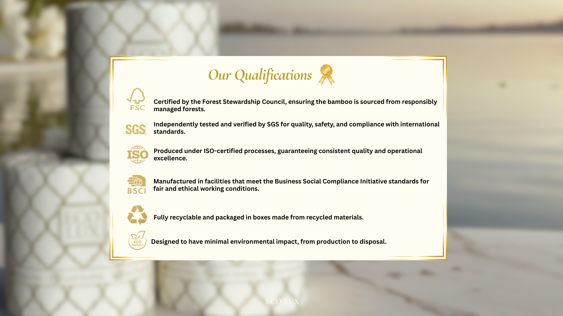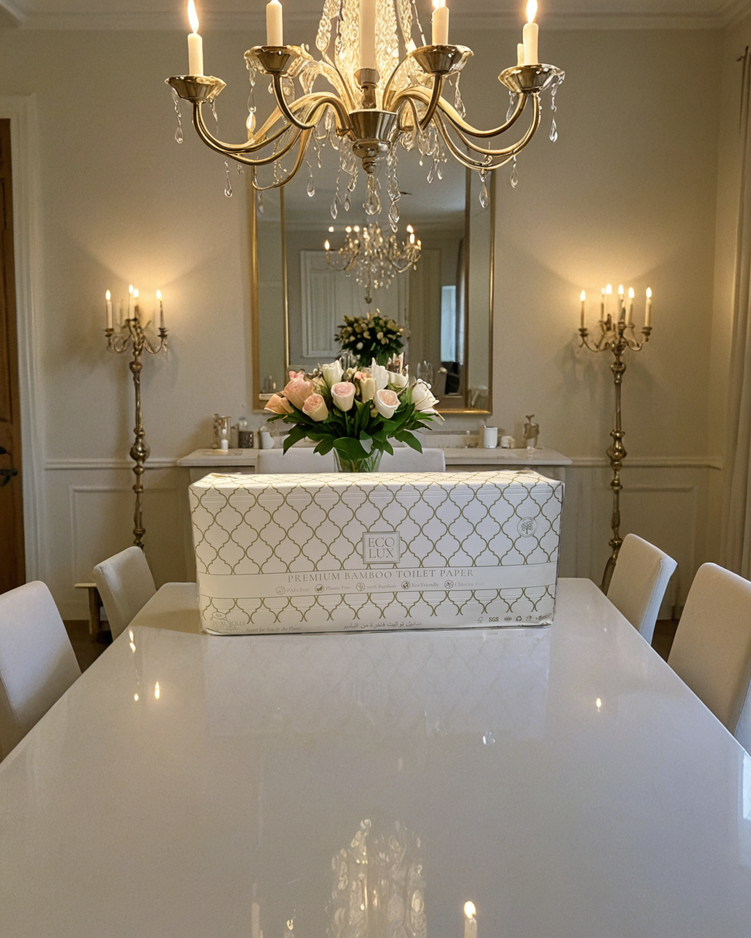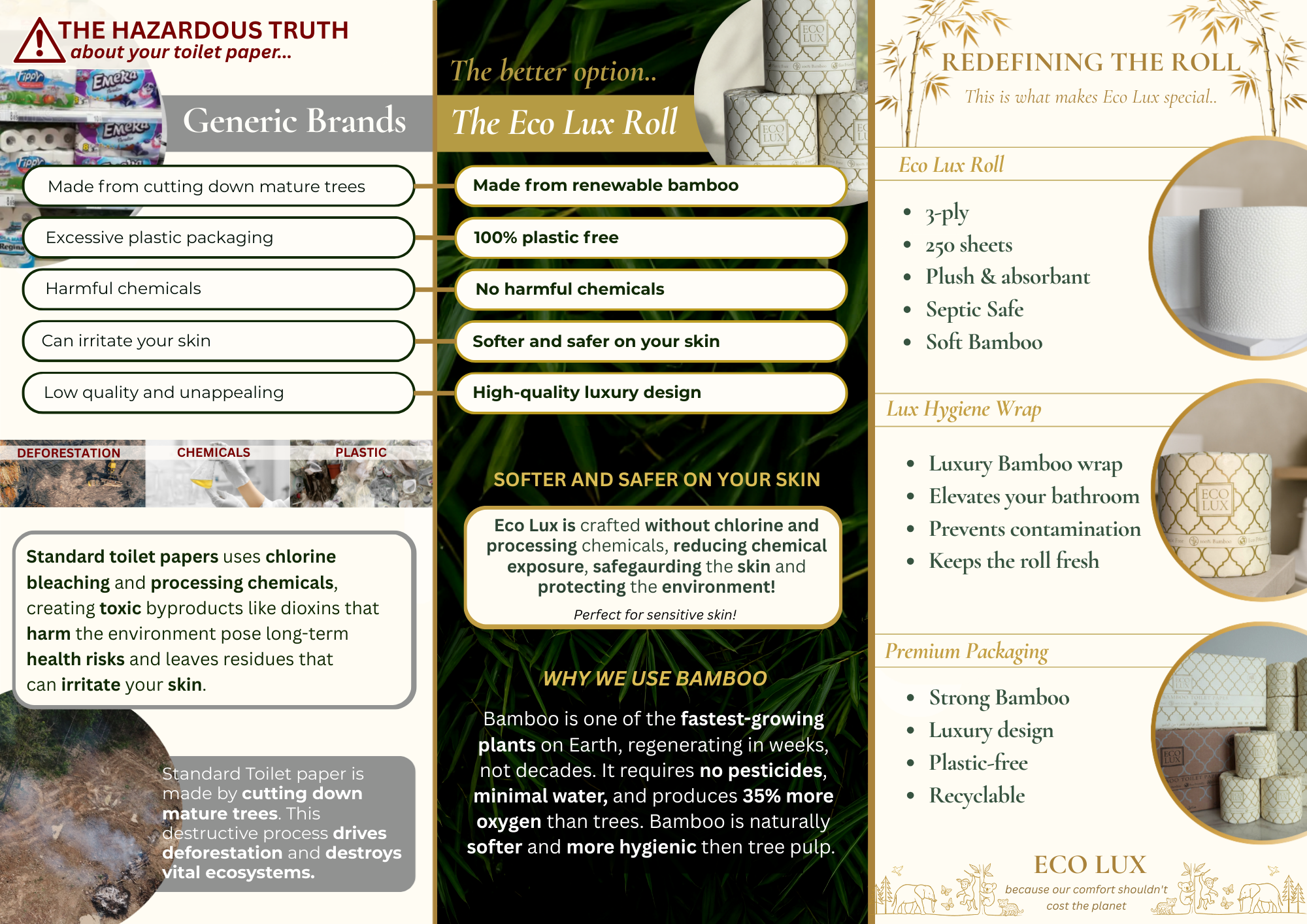 The Eco Lux roll is made from renewable bamboo, providing a softer, more sustainable alternative to traditional materials. Our absorbent 3-ply design delivers plush thickness, while remaining septic-safe, breaking down easily to protect plumbing and septic systems. Unlike standard toilet paper, Eco Lux does not contain chemical components and fluorescent agents, reducing exposure to harmful chemicals and making it safer for you and your home. Each roll is individually wrapped in our luxury crafted bamboo paper, ensuring hygiene, preventing contamination, and adding a refined touch to every bathroom. Fully plastic-free, Eco Lux combines sustainability, comfort and luxury in every roll.